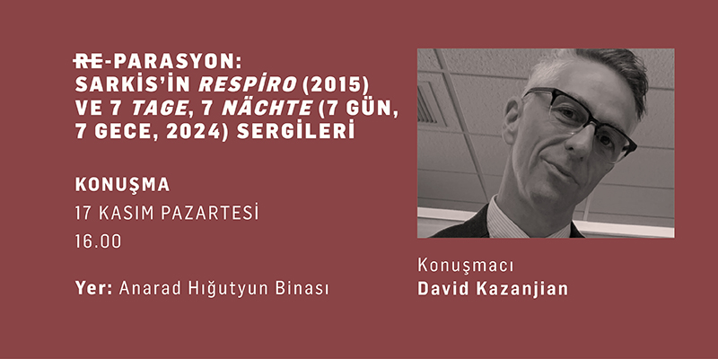 David Kazanjian konuşmasında Sarkis’in Respiro (Venedik Bienali 2015) ve 7 Tage, 7 Nächte (7 Gün, 7 Gece, Kunsthalle, Baden-Baden 2024) başlıklı sergilerinin bizi, reparasyon (onarım, telafi, tazminat) kavramını nasıl yeniden düşünmeye yönelttiğini gösteriyor. Eğer “parasyon” kelimesinin başına gelen re- ön eki, geçmişte meydana gelmiş hasarın öncesine dönmeyi ve hasarın öncesindeki bütünlüğü yeniden kurmayı hedefleyen bir adalet vaat ediyorsa, o zaman bu eki kaldırmak bizi şu anda kullanımda olmayan bir sözcükle baş başa bırakıyor: parasyon (paration). Bu sözcük eski kullanımında, gücünü koruyan bir kalkış noktasından hareket için hazırlanma sürecine karşılık geliyordu. Sarkis’in iki sergisi de, öncesinde ya da yazgısında bir bütünlüğe ait olmayan parçaların mevcut olduğu tam da böyle bir yeri hayal ediyor. Bu yer, reparasyonun yerine sürekli bir oluşu, kritik bir eşiği koyuyor.