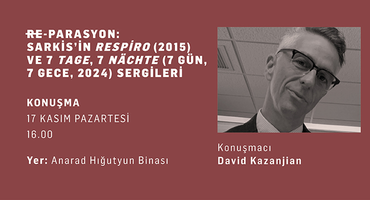 David Kazanjian konuşmasında Sarkis’in Respiro (Venedik Bienali 2015) ve 7 Tage, 7 Nächte (7 Gün, 7 Gece, Kunsthalle, Baden-Baden 2024) başlıklı sergilerinin bizi, reparasyon (onarım, telafi, tazminat) kavramını nasıl yeniden düşünmeye yönelttiğini gösteriyor.